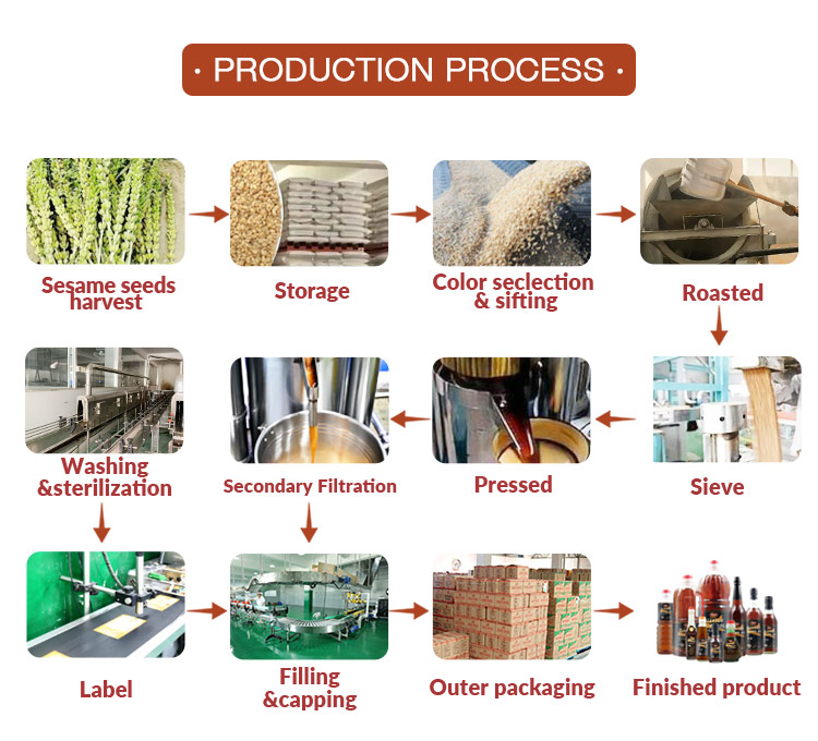 L'huile de sésame mélangée est principalement fabriquée en appuyant sur un mélange de graines de sésame blanc et noir. Les graines de sésame blanche sont riches en huile et en arôme, tandis que les graines de sésame noir sont riches en protéines, en vitamine E et en acides gras insaturés, et ont une valeur nutritionnelle et médicinale unique . Dans le processus de production, les graines de sésame sont généralement lavées et séchées d'abord, puis rôties, puis extraites par pressage ou extraction d'eau, et finalement filtrées et raffinées .